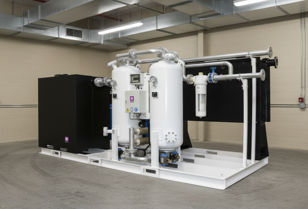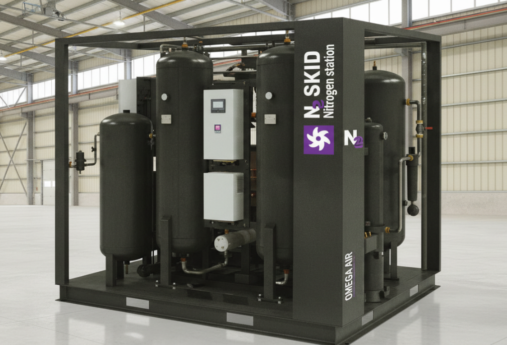 Gli elementi della stazione di produzione di azoto sono integrati in un'unità SKID compatta.